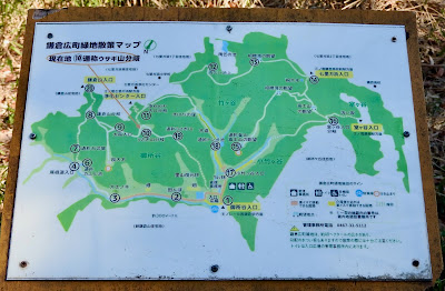 大きな地図 入り口の階段をのぼると大きな地図があります。 Big Map Climb the steps at the Entrance and you will see a large map. According to official website of Kamakura Hiromachi Ryokuchi only in Japanese, (translated by me) "Kamakura Hiromachi Ryokuchi is an 'Urban Woodland' located in the Koshigoe area in the southwestern part of Kamakura City. The vast green space of about 48ha is formed by intricate valleys and hills, and a high-quality ecosystem is maintained with a diverse waterside environment where spring water flows. The time required for one lap is about one and a half to two hours (outer course). 'Urban Woodland' : A city park whose purpose is mainly to protect the habitat of animals and plants." |